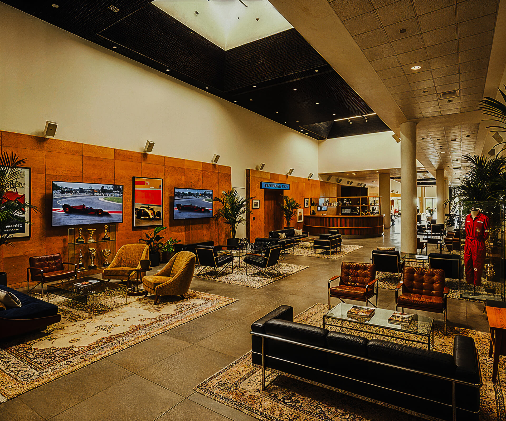 Experience the ambience of an old-school Madrid club, live jazz on a central stage, with elegant wood paneling, house plants, and vintage rugs creating a stylish, intimate setting for your luxury F1® event.